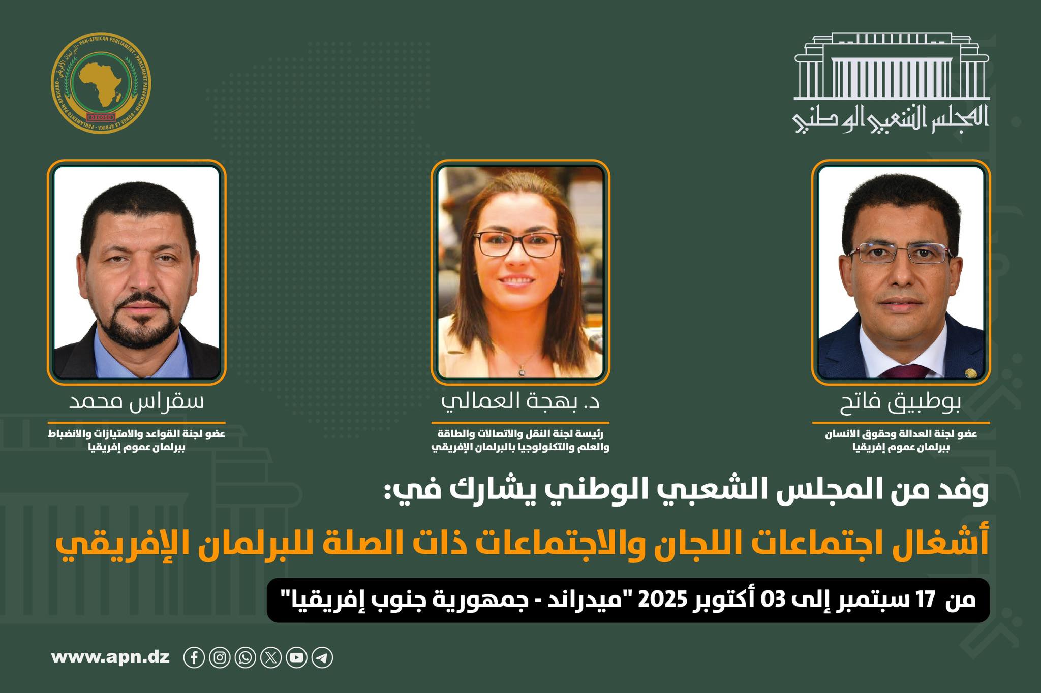 يشارك وفد عن المجلس الشعبي الوطني في أشغال اجتماعات اللجان والاجتماعات ذات الصلة بالبرلمان الإفريقي، المزمع عقدها بمدينة ميدراند بجمهورية جنوب إفريقيا، خلال الفترة الممتدة من 17 سبتمبر إلى 03 أكتوبر 2025.