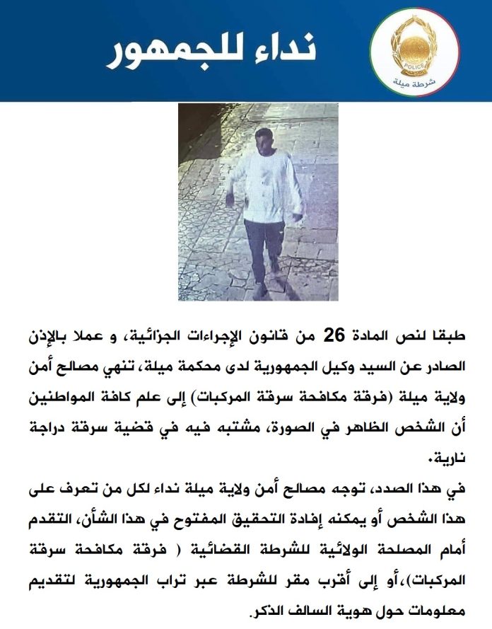 وعليه، تدعو كل من يتعرف على هذا الشخص أو يملك معلومات بخصوصه، إلى التقدم إلى مقر فرقة مكافحة سرقة المركبات بولاية ميلة، أو إلى أقرب مقر للشرطة عبر تراب الجمهورية، لتقديم إفادة أو معلومات تفيد التحقيق المفتوح في هذه القضية.
