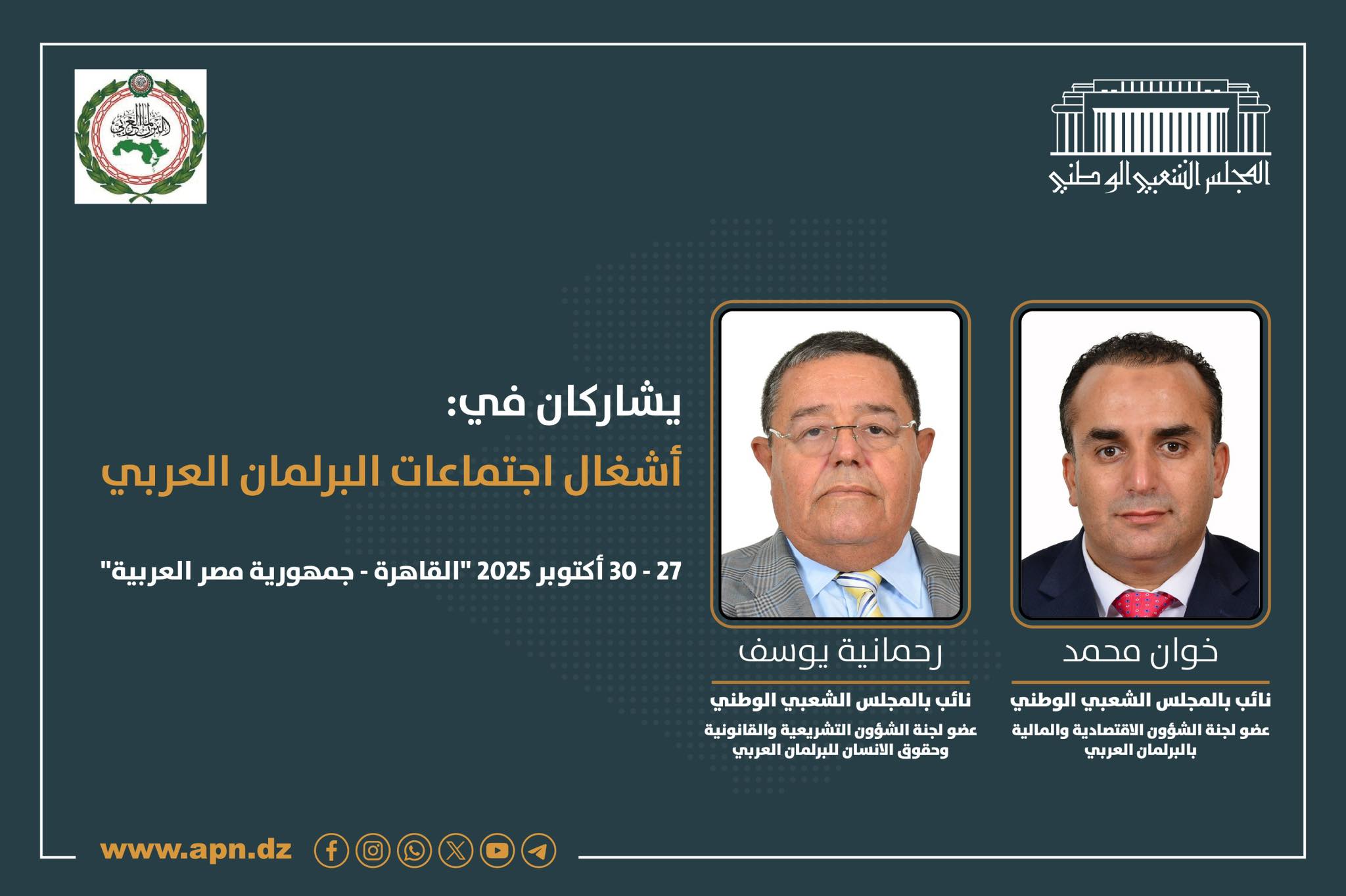 يشارك السيدان محمد خوان، عضو لجنة الشؤون الاقتصادية والمالية بالبرلمان العربي، ويوسف رحمانية، عضو لجنة الشؤون التشريعية والقانونية وحقوق الإنسان، في أشغال اجتماعات البرلمان العربي المقرر عقدها من 27 إلى 30 أكتوبر 2025 بالعاصمة المصرية القاهرة.