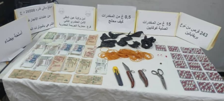 وخلال المداهمة، تم حجز 243 قرصًا مهلوسًا و15 غرامًا من المخدرات الصلبة (كوكايين)، بالإضافة إلى قطعة من الكيف المعالج، وأسلحة بيضاء، إلى جانب مبالغ مالية تمثل عائدات النشاط الإجرامي.