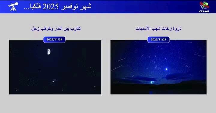 🔭 ففي 21 نوفمبر، ستشهد الجزائر ذروة زخات شهب الأسديات، وهي ظاهرة سنوية تنتج عن مرور الأرض عبر حطام المذنب “تمبل-تاتل”. ويمكن مشاهدة الشهب بوضوح في سماء صافية بعيدًا عن التلوث الضوئي.