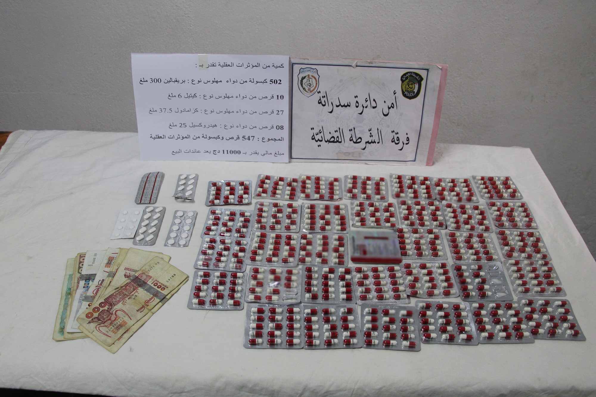 وأسفرت العملية عن توقيف اثنين من المشتبه فيهم وضبط بحوزة أحدهما كمية من المؤثرات العقلية بلغت 325 كبسولة، بالإضافة إلى مبلغ مالي قدره 11,000 دج يعتقد أنه من عائدات البيع.