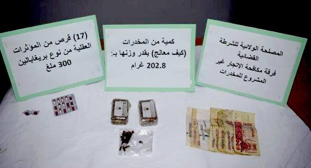 العملية جاءت عقب عمل استعلاماتي دقيق، سمح بتحديد نشاط المشتبه فيه ومكان ترويجه. وقد تم توقيفه في حالة تلبس أثناء ممارسته لنشاطه الإجرامي داخل الحي. كما أسفرت عملية تفتيش قانونية لمسكنه عن حجز 202.8 غرام من الكيف المعالج، و17 كبسولة من المؤثرات العقلية، إضافة إلى مقص و7 قطع حادة “كيتار” ومبلغ مالي من عائدات بيع السموم.