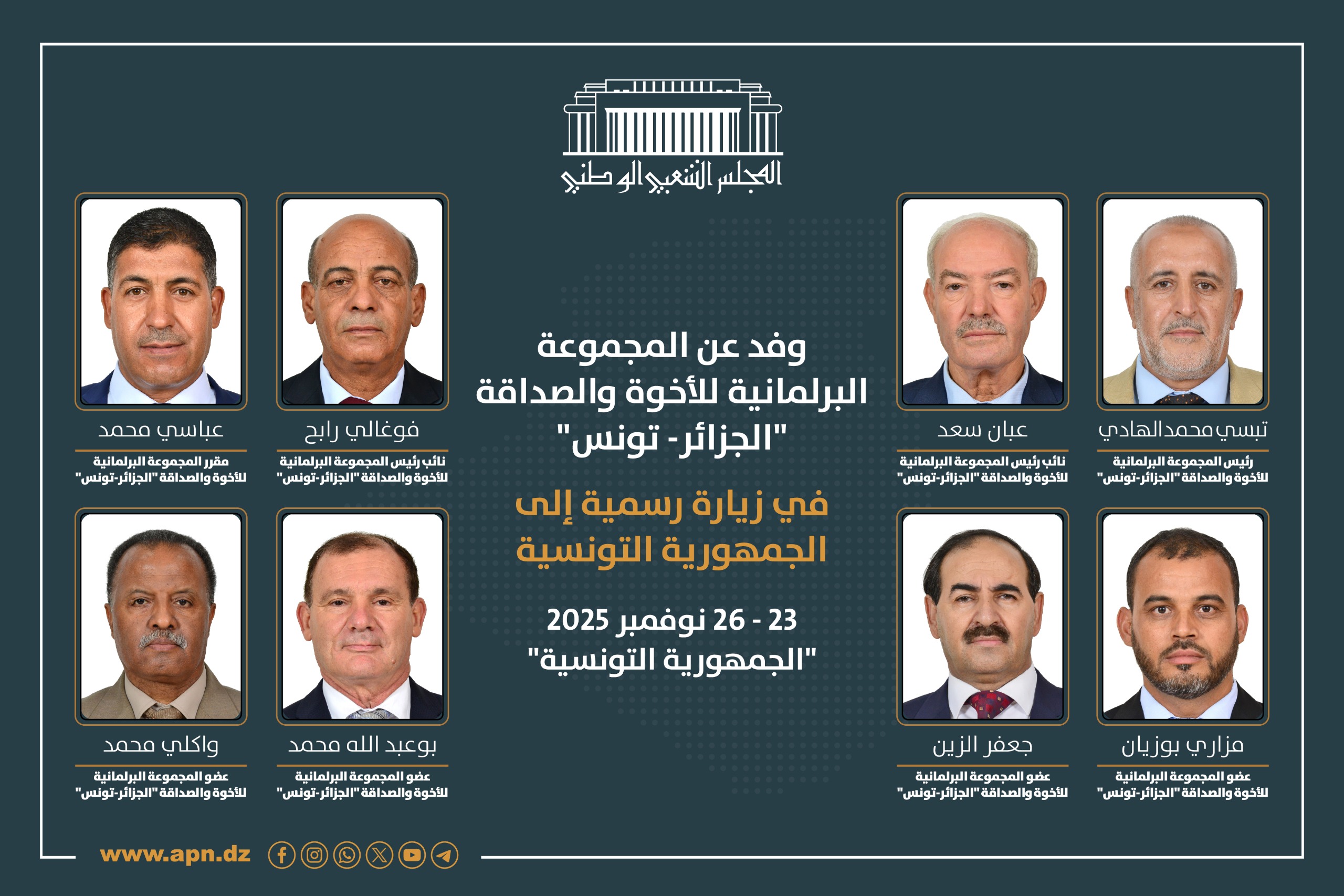 يقوم وفد عن المجموعة البرلمانية للأخوة والصداقة “الجزائر–تونس”، برئاسة السيد محمد الهادي تبسي رئيس المجموعة، بزيارة رسمية إلى الجمهورية التونسية خلال الفترة الممتدة من 23 إلى 26 نوفمبر 2025، وذلك في إطار تعزيز التعاون البرلماني بين البلدين الشقيقين.
