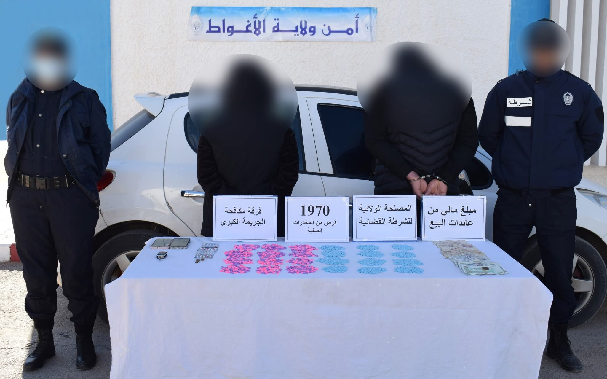 في إطار مكافحة ظاهرة المخدرات والمؤثرات العقلية، تمكنت فرقة مكافحة الجريمة الكبرى بالمصلحة الولائية للشرطة القضائية بأمن ولاية الأغواط من توقيف رجل وامرأة في العقد الثالث من عمرهما، وذلك بعد تورطهما في حيازة 1970 قرصًا من المخدرات الصلبة من نوع إكستازي، إضافة إلى كمية أخرى من المؤثرات العقلية والكيف المعالج، ومبلغ مالي من عائدات البيع.