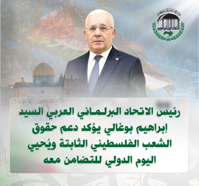 أصدر السيد إبراهيم بوغالي، رئيس الاتحاد البرلماني العربي ورئيس المجلس الشعبي الوطني، اليوم السبت 29 نوفمبر 2025، بياناً بمناسبة اليوم الدولي للتضامن مع الشعب الفلسطيني، الذي أقرته الجمعية العامة للأمم المتحدة منذ عام 1977.