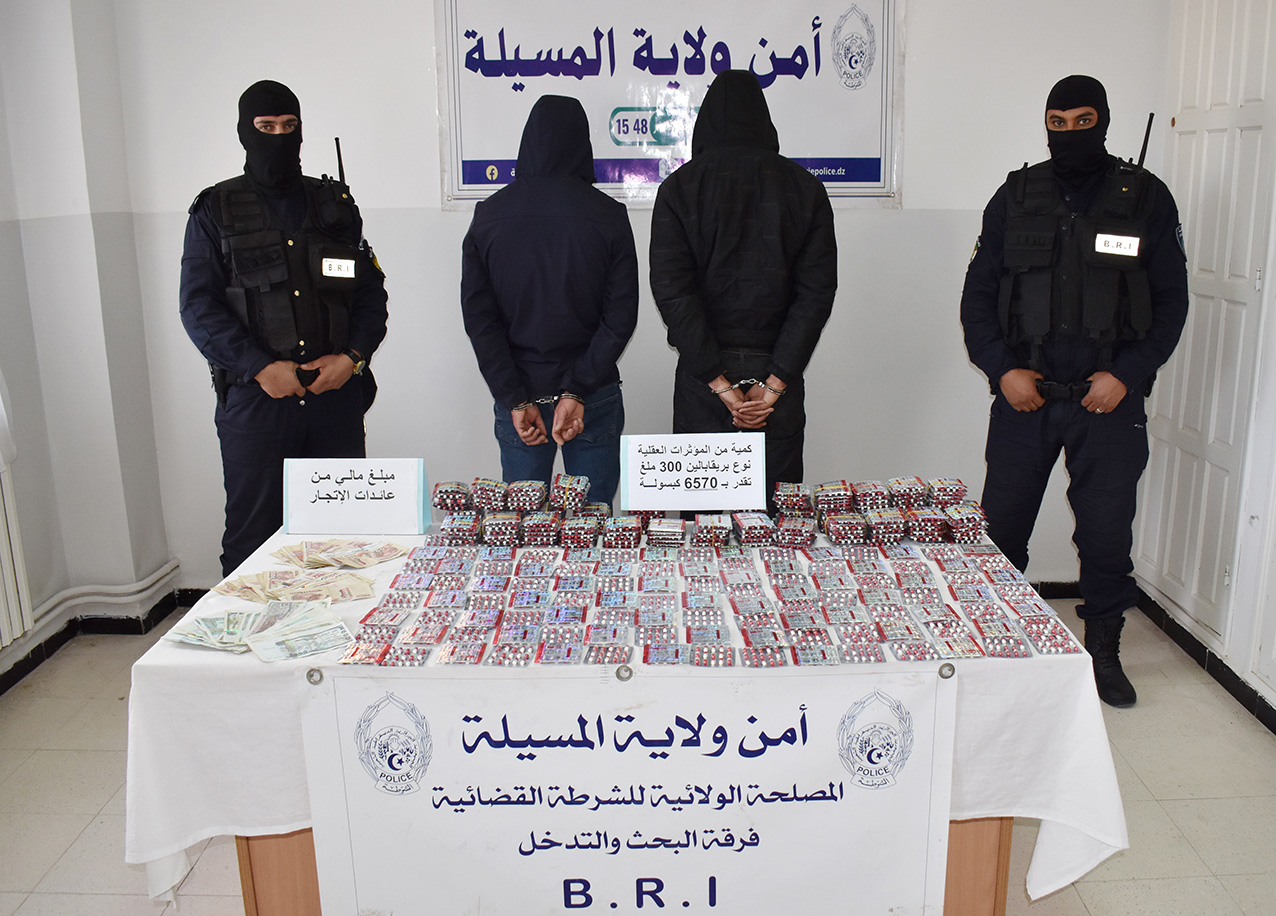 تمكنت عناصر فرقة البحث والتدخل (BRI) بأمن ولاية المسيلة من توقيف شخصين مشتبه فيهما في قضية متعلقة بالمؤثرات العقلية، حيث تم حجز 6570 كبسولة من المخدرات، إضافة إلى استرجاع مبلغ مالي ومركبة كانت مستخدمة في نشاطهما الإجرامي. تمت مباشرة الإجراءات القانونية اللازمة قبل تقديمهما أمام الجهات القضائية المختصة.