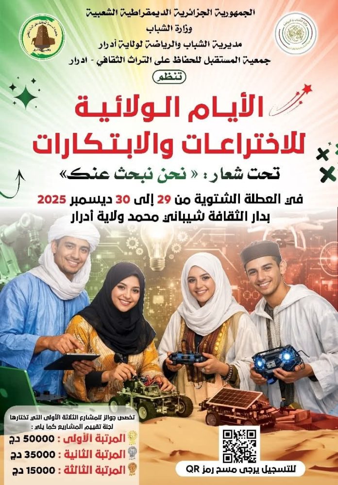 أشرف السيد محمد مقدم، مدير الشباب والرياضة بولاية أدرار، على مراسم اختتام الأيام الولائية لاختراعات وابتكارات الشباب المقامة يومي 29-30 ديسمبر 2025 ، حيث تكريم أفضل الأعمال بشهادات تقديرية ومبالغ مالية رمزية تصل إلى 50 ألف دينار جزائري للأول و30 ألف للثاني .