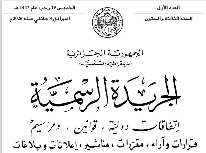 صدر في العدد الأول من الجريدة الرسمية لسنة 2026، المرسوم الرئاسي رقم 26-01 المؤرخ في 18 رجب 1447 هـ الموافق لـ 7 جانفي 2026، والذي يحدد الأجر الوطني الأدنى المضمون.