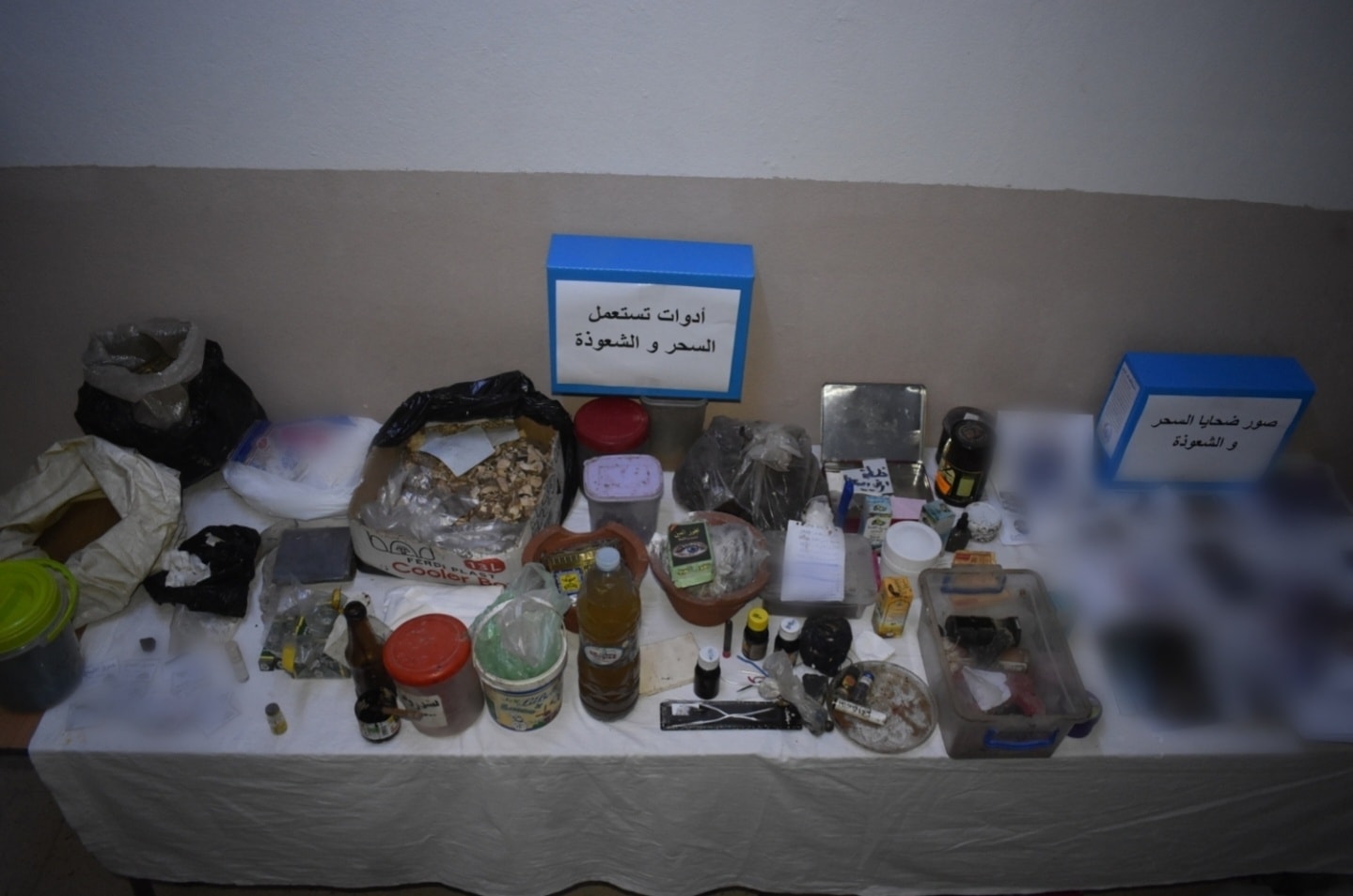 معدات وأدوات وطلاسم وصور فوتوغرافية لأشخاص يُستغلون في أعمال الشعوذة.